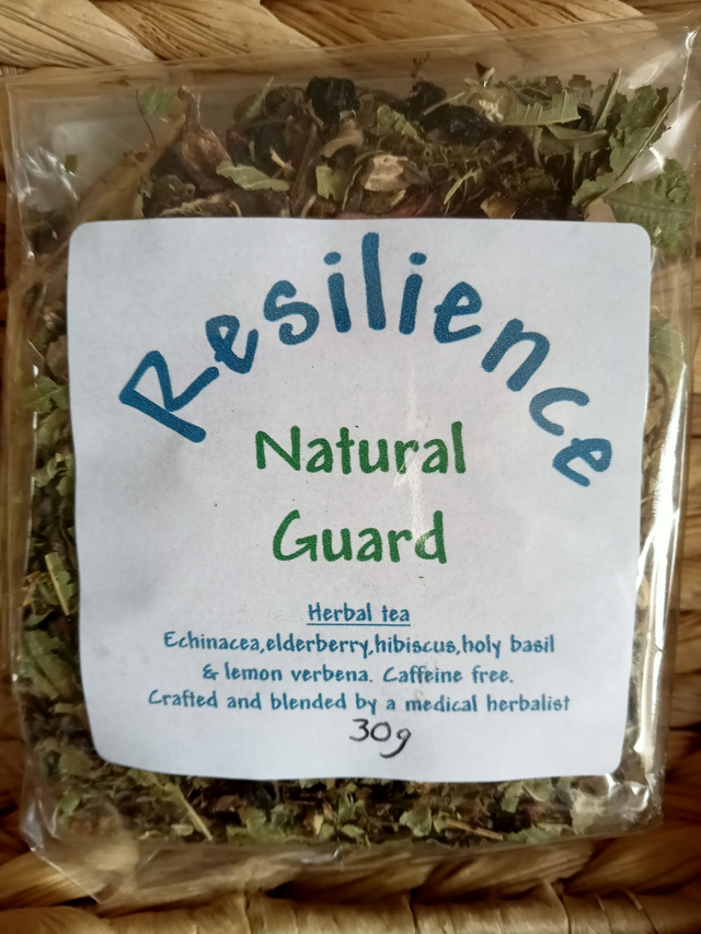 Resilience – Natural Guard is a vibrant herbal infusion crafted to nourish your natural defenses. With immune-supporting echinacea and elderberry, antioxidant-rich hibiscus, and the balancing power of holy basil and lemon verbena.